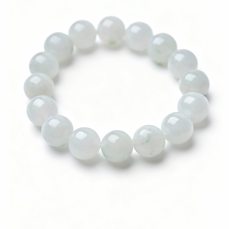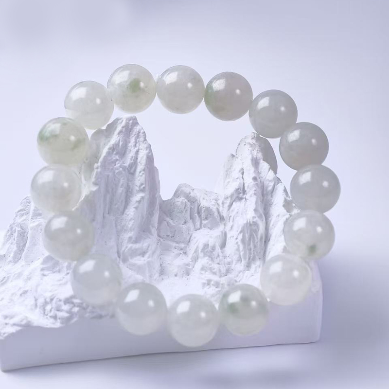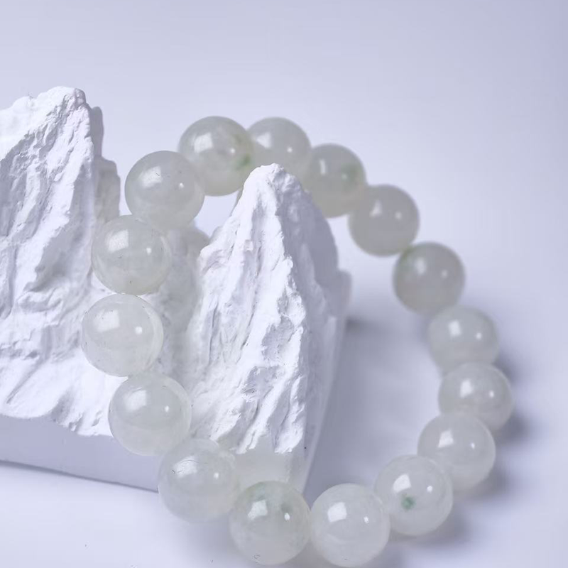 “Discover the art of poetic understatement with this exquisite Light White Jadeite Bracelet featuring 13mm round beads adorned with natural floating florals. Each bead captures the essence of spontaneous beauty and effortless grace, where delicate mineral inclusions dance like ink strokes in a literati painting. The soft white background represents purity of intention, while the floating patterns symbolize life’s beautiful unpredictability.